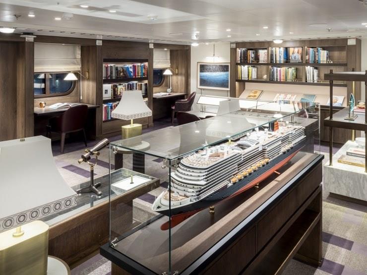 Nestled within the Grand Lobby Boutiques, you can find unique spaces like the Cabinet of Curiosities and Experience Lounge. The Cabinet of Curiosities is a one-of-a-kind rotunda gallery showcasing a 360 degree display of collectables, jewelery, fashion, and art from our partner brands alongside never before seen items from the Cunard archives. Continuously open for exploration, this eclectic collection of curated products, artifacts, and treasures is presented alongside audio and visual media to celebrate the style and intrigue of travel.